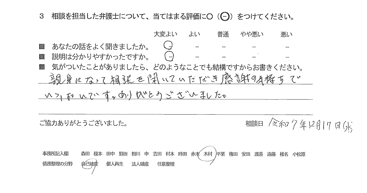 親身になって相談を聞いていただき感謝の気持ちでいっぱいです。 ありがとうございました。