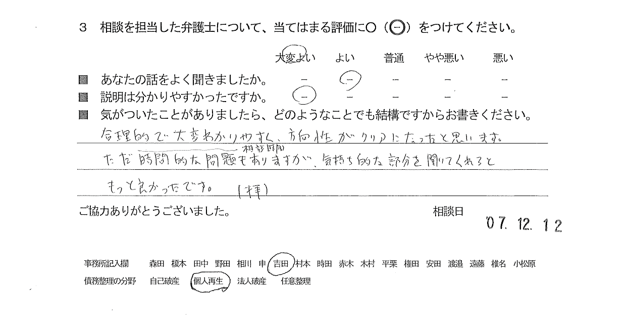 合理的で大変わかりやすく、方向性がクリアになったと思います。 ただ時間的な問題もありますが、ーー相談時間 気持ち的な部分を聞いてくれるともっと良かったです。(拝)