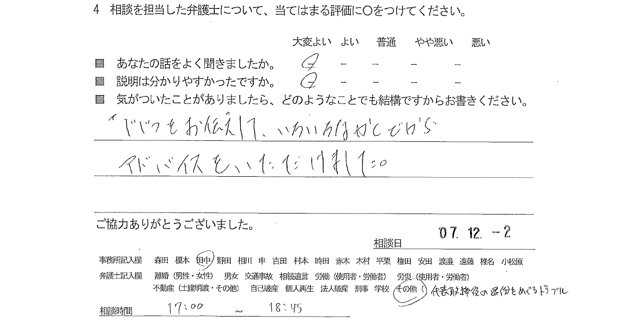 お客様の声(ご相談者の声)評判・口コミ 公開日:2026/01/14 お客様の声 ご相談者の声 ■年代 ■担当弁護士 ■あなたの話をよく聞きましたか ■説明はわかりやすかったですか - 田中 智美 大変よい 大変よい じじつをお伝えして、いろいろなかくどからアドバイスをいただけました。 「お客様の声(ご相談者の声)評判・口コミ」 「お客様の声(ご相談者の声)評判・口コミ」