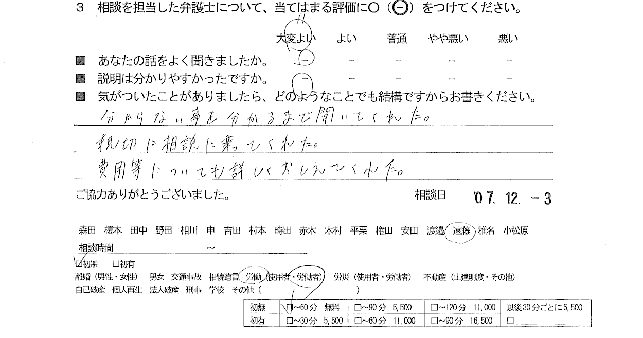 分からない事を分かるまで聞いてくれた。親切に相談に乗ってくれた。 費用等についても詳しくおしえてくれた。