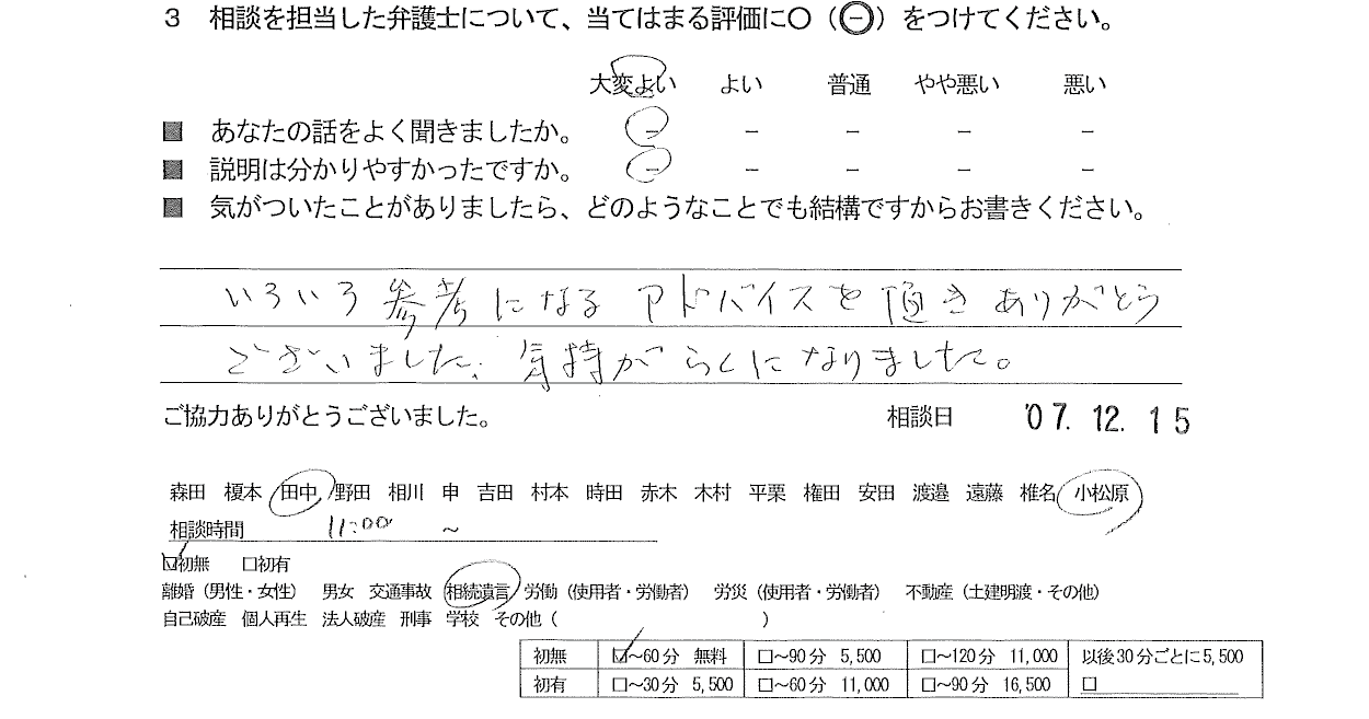 お客様の声(ご相談者の声)評判・口コミ 公開日:2026/01/15 お客様の声 ご相談者の声 ■年代 ■担当弁護士 ■あなたの話をよく聞きましたか ■説明はわかりやすかったですか - 田中 智美・小松原 柊 大変よい 大変よい いろいろ参考になるアドバイスを頂きありがとうございました。 気持がらくになりました。 「お客様の声(ご相談者の声)評判・口コミ」 「お客様の声(ご依頼者の声)評判・口コミ」