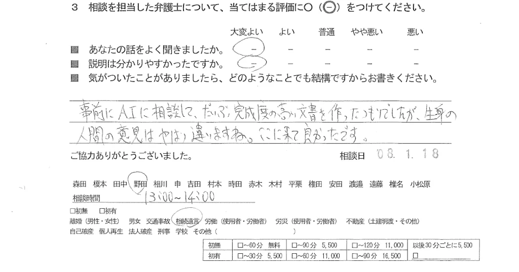 お客様の声(ご相談者の声)評判・口コミ 公開日:2026/02/13 お客様の声 ご相談者の声 ■担当弁護士 野田 泰彦 ■あなたの話をよく聞きましたか 大変よい ■説明はわかりやすかったですか 大変よい 事前にAIに相談して、だいぶ完成度の高い文書を作ったつもりでしたが、生身の人間の意見はやはり違いますね。ここに来て良かったです。 関連投稿: お客様の声(ご相談者の声)評判・口コミ お客様の声(ご相談者の声)評判・口コミ お客様の声(ご相談者の声)評判・口コミ お客様の声(ご相談者の声)評判・口コミ 「お客様の声(ご相談者の声)評判・口コミ」 「お客様の声(ご相談者の声)評判・口コミ」