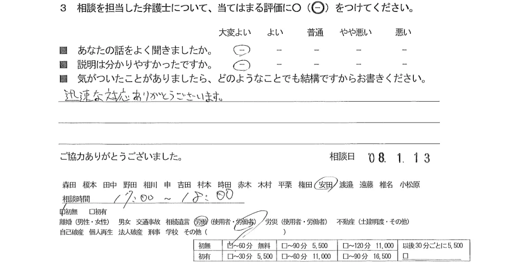 お客様の声(ご相談者の声)評判・口コミ 公開日:2026/02/13 お客様の声 ご相談者の声 ■担当弁護士 吉田 竜二 ■あなたの話をよく聞きましたか 大変よい ■説明はわかりやすかったですか 大変よい 迅速な対応ありがとうございます。 関連投稿: お客様の声(ご相談者の声)評判・口コミ お客様の声(ご相談者の声)評判・口コミ お客様の声(ご相談者の声)評判・口コミ お客様の声(ご相談者の声)評判・口コミ 「お客様の声(ご相談者の声)評判・口コミ」 「お客様の声(ご相談者の声)評判・口コミ」