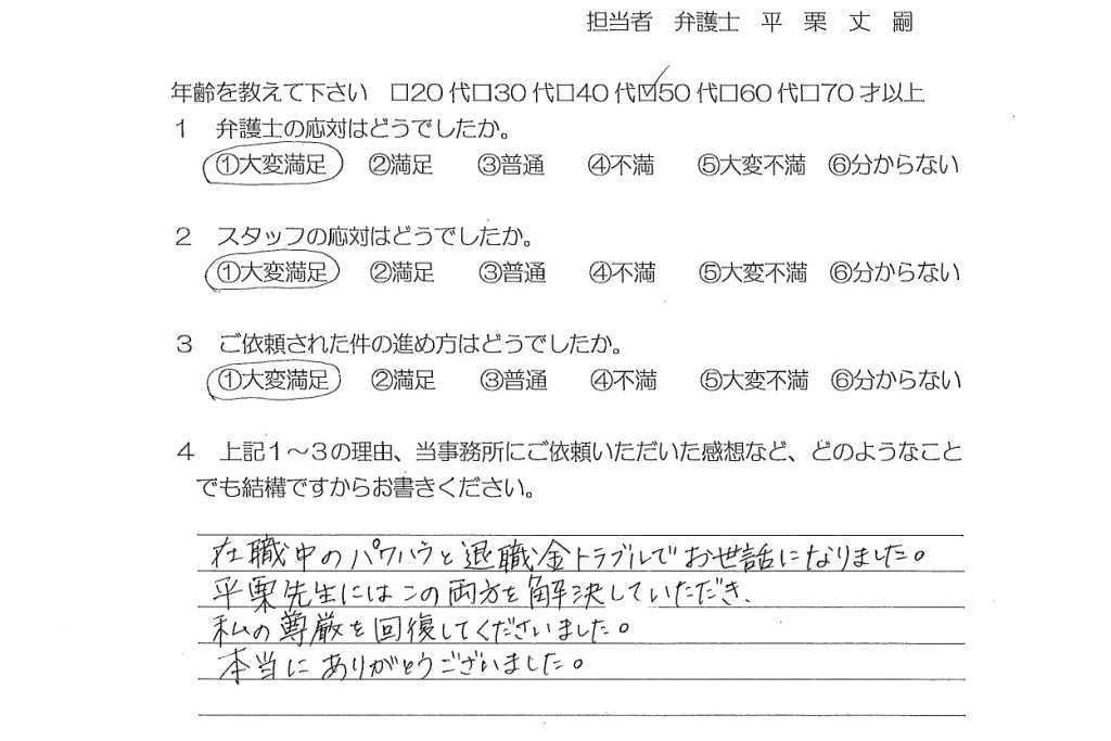 在職中のパワハラと退職金トラブルでお世話になりました。