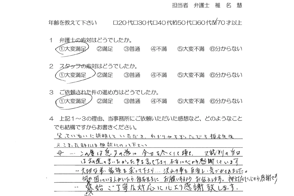母…この度は息子の為に全力を尽くしていただき、又、裁判の当日には私達の言いたかった事を言って下さり、本当に心から感謝しています。